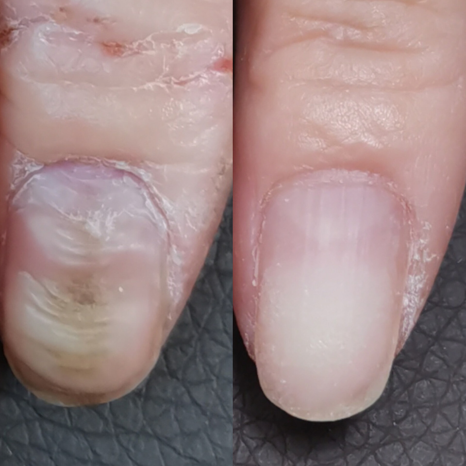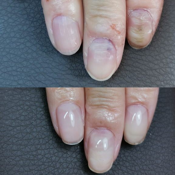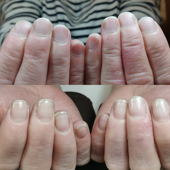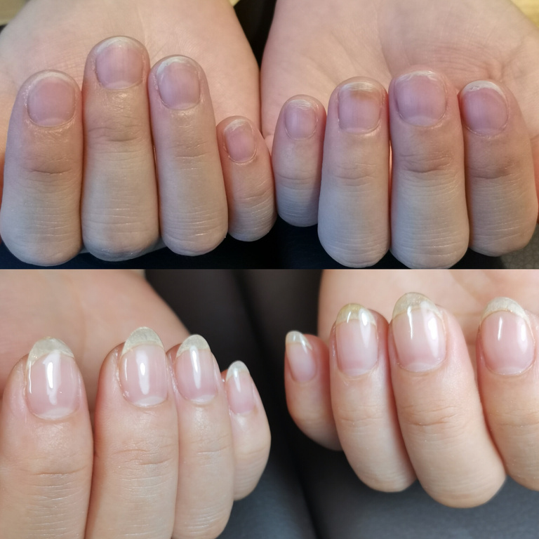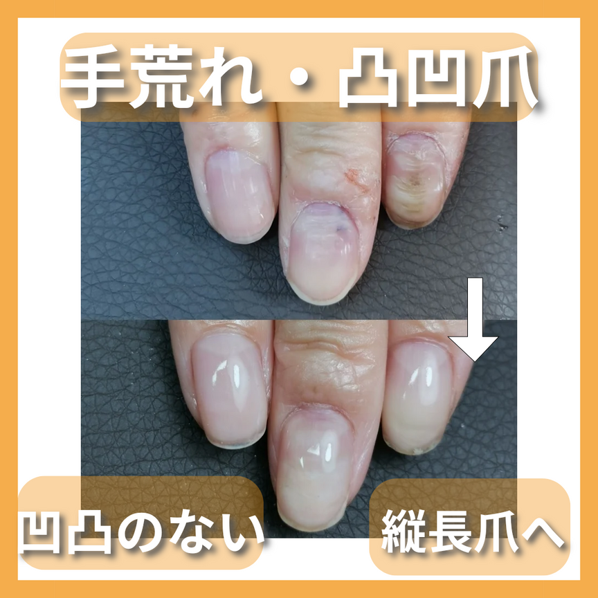 職業柄手荒れが酷くネイルをしても根元が浮いてしまいお客様の髪の毛がひっかてしまったりと、手荒れもひどいのでジェルは浮いてしまうものだとネイルは諦めていましたが、自爪育成を始めて見た目も凹凸も目立たなくなり印象が変わり、根元の浮きも全くなくなり感動しました。今後の変化もとても楽しみです。